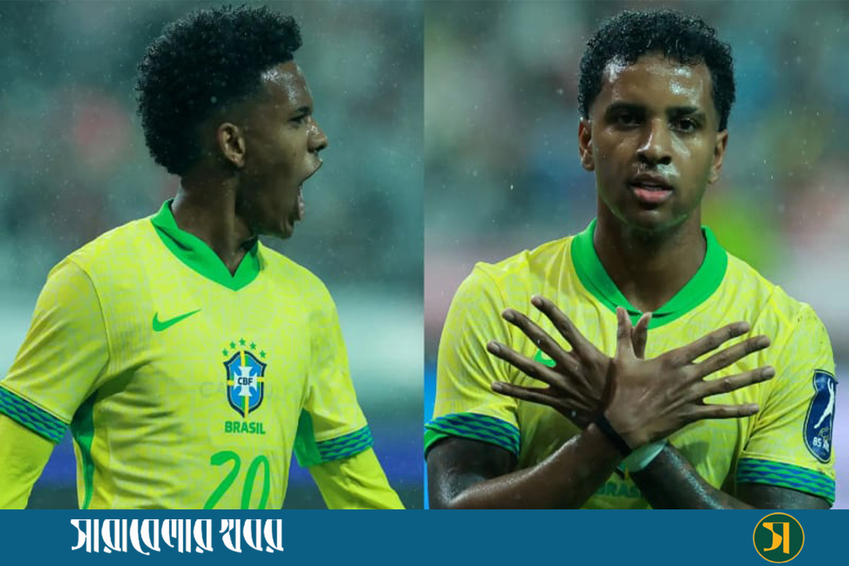 আন্তর্জাতিক প্রীতি ম্যাচে দুর্দান্ত পারফরম্যান্স দেখাল ব্রাজিল। রদ্রিগো ও এস্তেভাওয়ের জোড়া গোলে সেলেসাওরা ৫-০ ব্যবধানে দক্ষিণ কোরিয়াকে উড়িয়ে দিয়েছে। দলের হয়ে পঞ্চম গোলটি করেন ভিনিসিয়ুস জুনিয়র। শুক্রবার সিওল ওয়ার্ল্ড কাপ স্টেডিয়ামে অনুষ্ঠিত ম্যাচে শুরু থেকেই স্বাগতিকদের ওপর আধিপত্য বিস্তার করে কার্লো আনচেলত্তির দল। ম্যাচের ১৩ মিনিটেই ব্রুনো গুইমারেসের রক্ষণচেরা পাস থেকে গোল করে ব্রাজিলকে এগিয়ে দেন তরুণ তুর্কি এস্তেভাও।