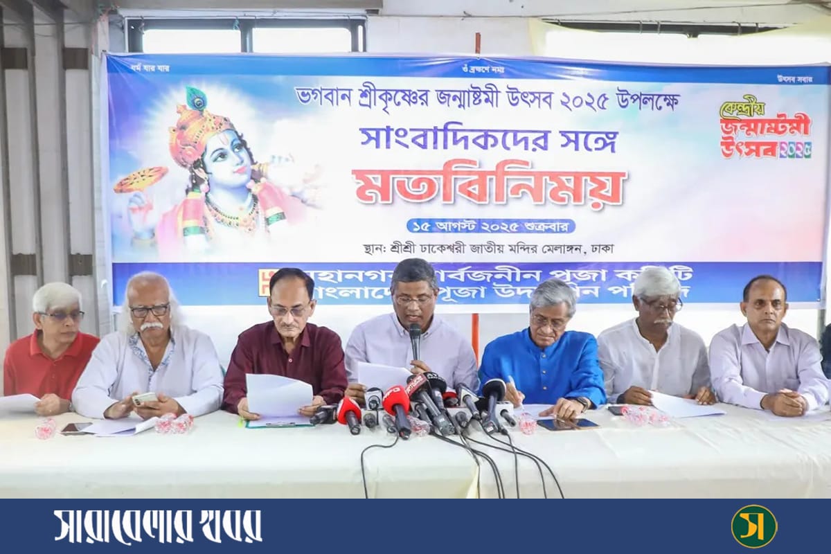 শুক্রবার (১৫ আগস্ট) সকালে রাজধানীর শ্রীশ্রী ঢাকেশ্বরী জাতীয় মন্দিরে জন্মাষ্টমী উৎসব-২০২৫ উপলক্ষে সাংবাদিকদের সঙ্গে মতবিনিময় সভায় লিখিত বক্তব্যে এসব তথ্য জানান মহানগর সার্বজনীন পূজা কমিটির সভাপতি জয়ন্ত কুমার দেব। বাংলাদেশ পূজা উদ্যাপন পরিষদ ও মহানগর সার্বজনীন পূজা কমিটি যৌথভাবে এই মতবিনিময় সভার আয়োজন করে।