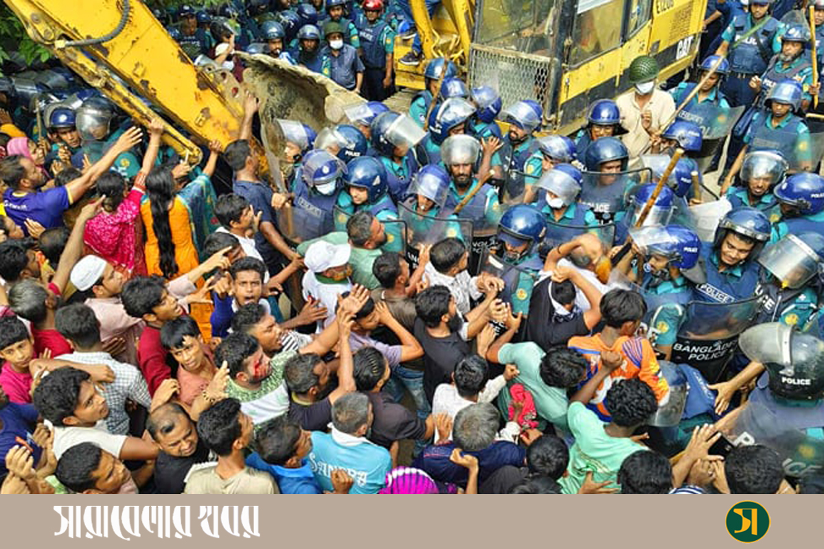 এ সময় উচ্ছেদ অভিযানে নিয়ে যাওয়া বুলডেজার ভেঙে দেওয়া হয়। স্থানীয়দের দাবি, পুনর্বাসনের ব্যবস্থা না করলে তারা উচ্ছেদ করতে দেবে না। খুলনা মেট্রোপলিটন পুলিশের সূত্র জানায়, ম্যাজিস্ট্রেটের নির্দেশে আপাতত উচ্ছেদ অভিযান স্থগিত রয়েছে। পুলিশের ওসিসহ বেশ কয়েকজন আহত হয়েছেন। বিস্তারিত পরে জানানো হবে।