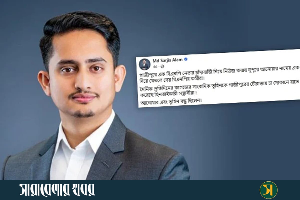 এ বিষয়ে তানভীর সিরাজ বলেন, অপরাধী চক্রের ভিডিও ধারণ করায় সাংবাদিক তুহিনকে নির্মমভাবে হত্যা করা হয়। কিন্তু এনসিপির মুখ্য সংগঠক (উত্তরাঞ্চল) সারজিস আলম না জেনেই ফেসবুকে এ ঘটনায় বিএনপিকে জড়িয়ে নানা অপপ্রচার চালিয়েছে, যা দলের ভাবমূর্তি নষ্ট করেছে।
